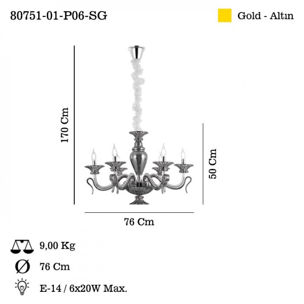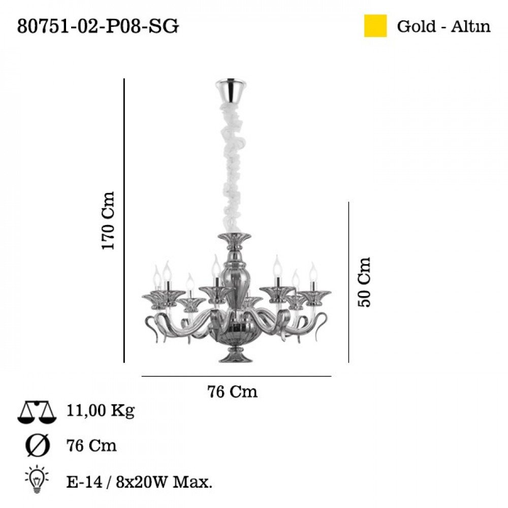 The BRAVA Glass‑Arm Chandelier E14 is a sophisticated lighting centerpiece designed to elevate any interior with its timeless elegance. Crafted in Turkey with exceptional attention to detail, this chandelier features gracefully curved glass arms, sculpted decorative elements, and a premium gold finish that reflects classic luxury.
