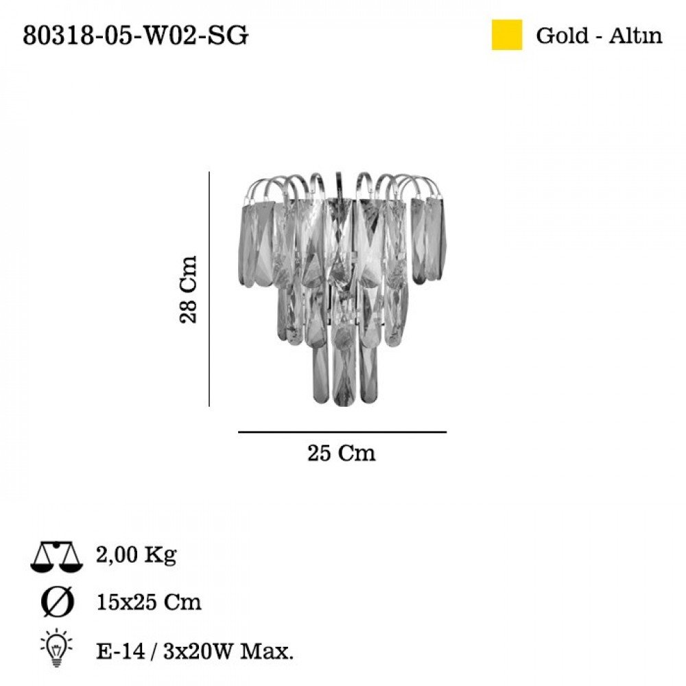 The CAVILLA Wall Lamp (80318-05-W02-SG) is designed to bring sophisticated brilliance to classic and modern interiors alike. Finished in rich Gold (Altın), this statement wall fixture features cascading faceted crystal elements arranged in layered tiers, creating depth, sparkle, and a striking decorative presence.
