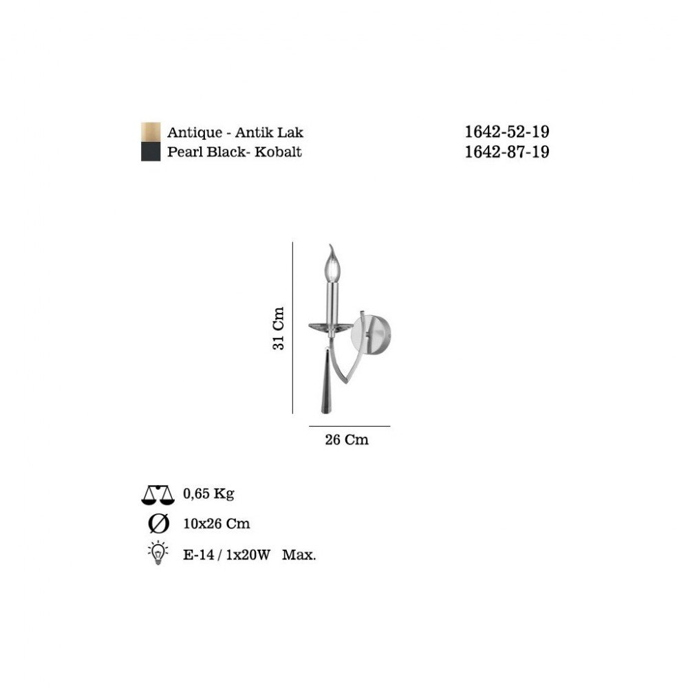 The FORMENA Wall Lamp (1642-52-19 / 1642-87-19) is a refined lighting piece inspired by classic candle-style design, reinterpreted with modern elegance. Its slender vertical structure and decorative metal detailing create a graceful silhouette that adds depth and character to both contemporary and traditional interiors.