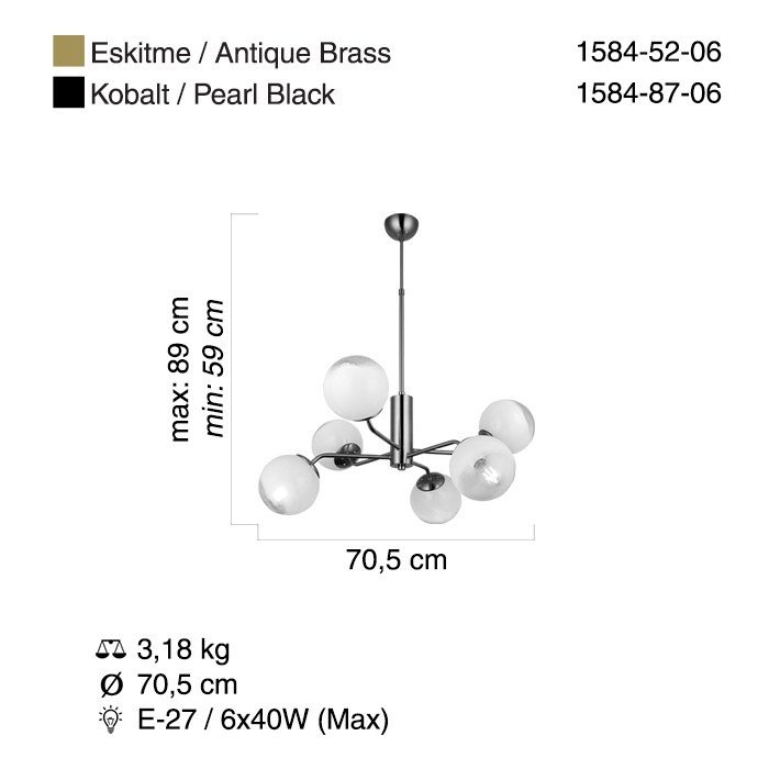 The SANTON 6‑Light Chandelier is a contemporary lighting fixture designed to make a refined statement in modern interiors. Its sculptural metal arms extend outward in a balanced composition, each supporting an opal glass globe that softly diffuses light for a warm and inviting atmosphere. The chandelier is available in Eskitme / Antique Brass and Kobalt / Pearl Black finishes, allowing it to blend seamlessly with both classic and modern décor styles.