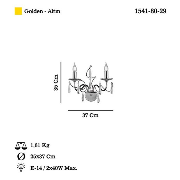 The TAVERNO Wall Lamp (1541-80-29) embodies refined classical elegance with its graceful curved arms and delicate crystal accents. Finished in luxurious Golden (Altın) tone, this decorative wall fixture adds warmth and prestige to living rooms, dining areas, hallways, and hospitality spaces.