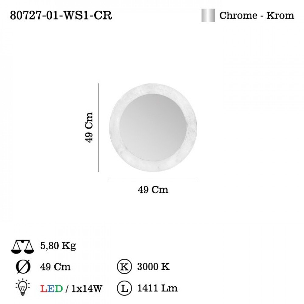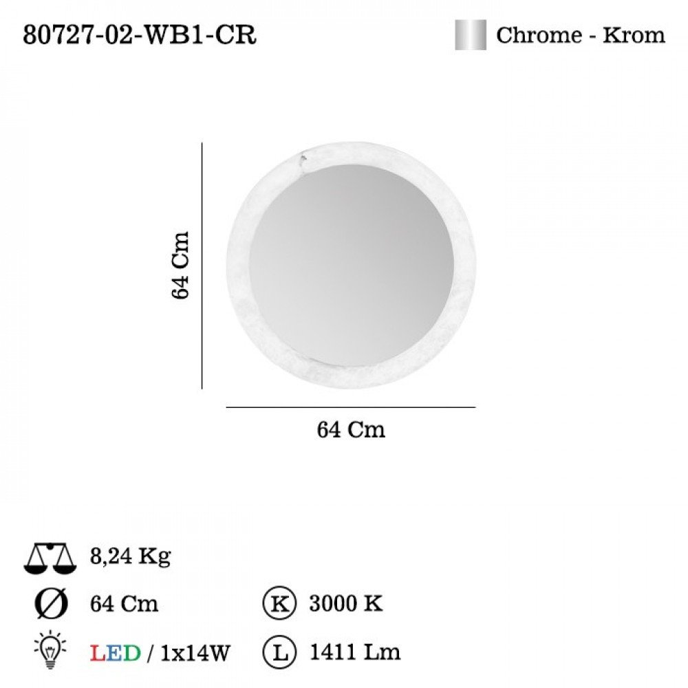 Powered by an energy-efficient 1 × 14W integrated LED, the VESCO Mirror delivers reliable performance and long-lasting illumination. The subtle textured frame and clean round silhouette give it a premium, timeless appearance that blends seamlessly with contemporary and luxury interiors.